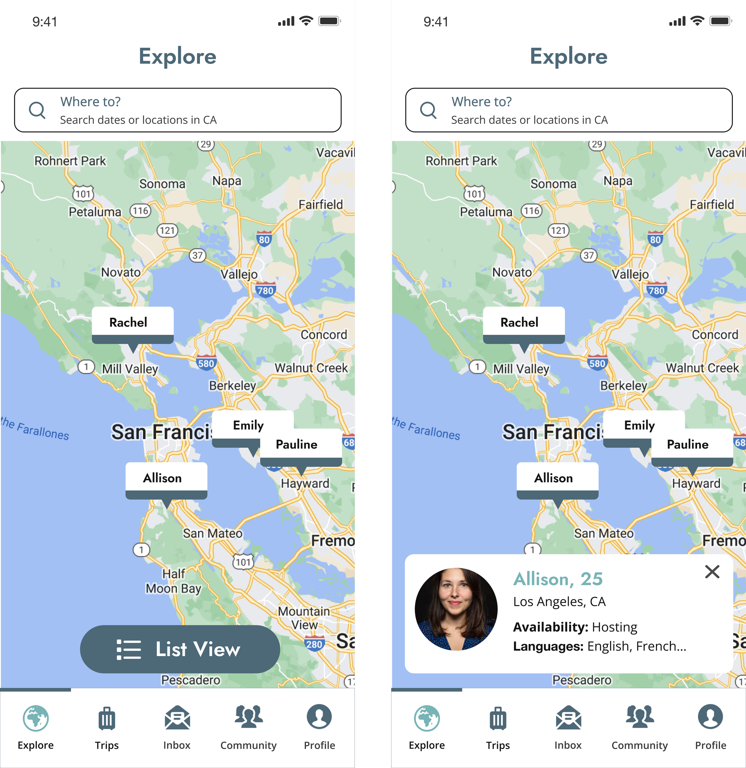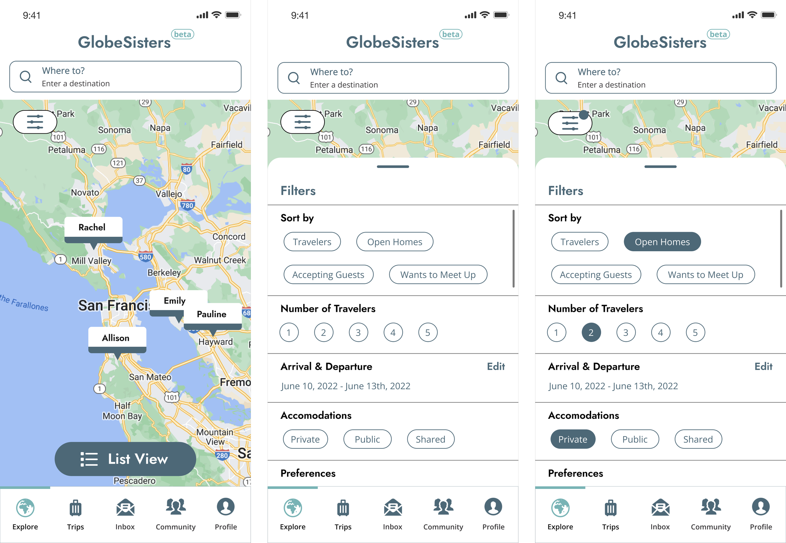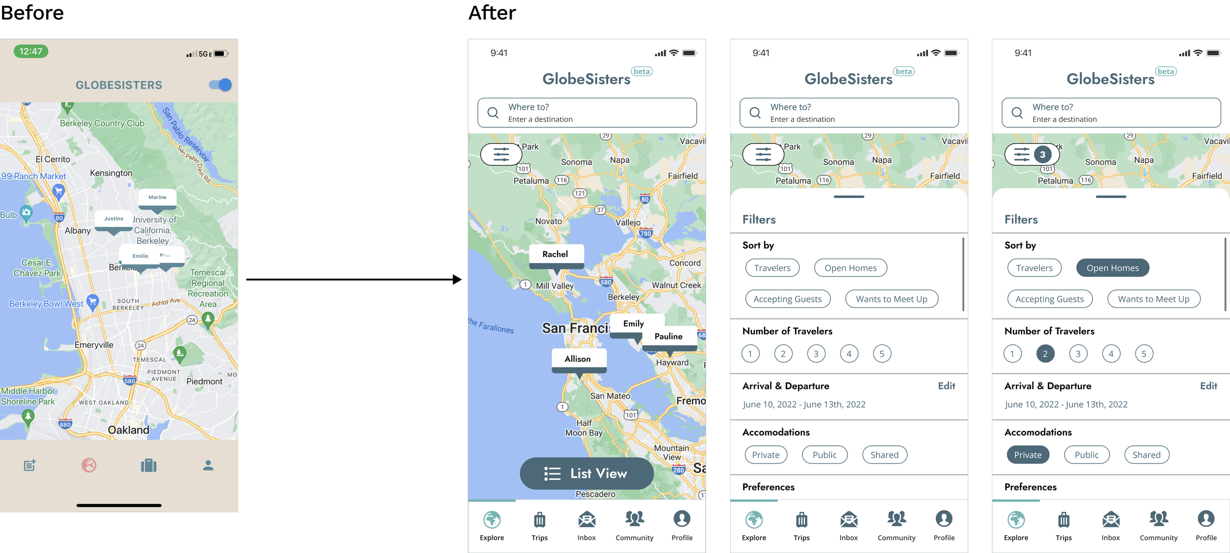 Through usability testing, I discovered that the current map-explore experience left many users confused. At first glance, it was very difficult to tell that the names on the map were other globesisters who were able to host others. This kept users from interacting with the screen in an appropriate way, leaving them disoriented.